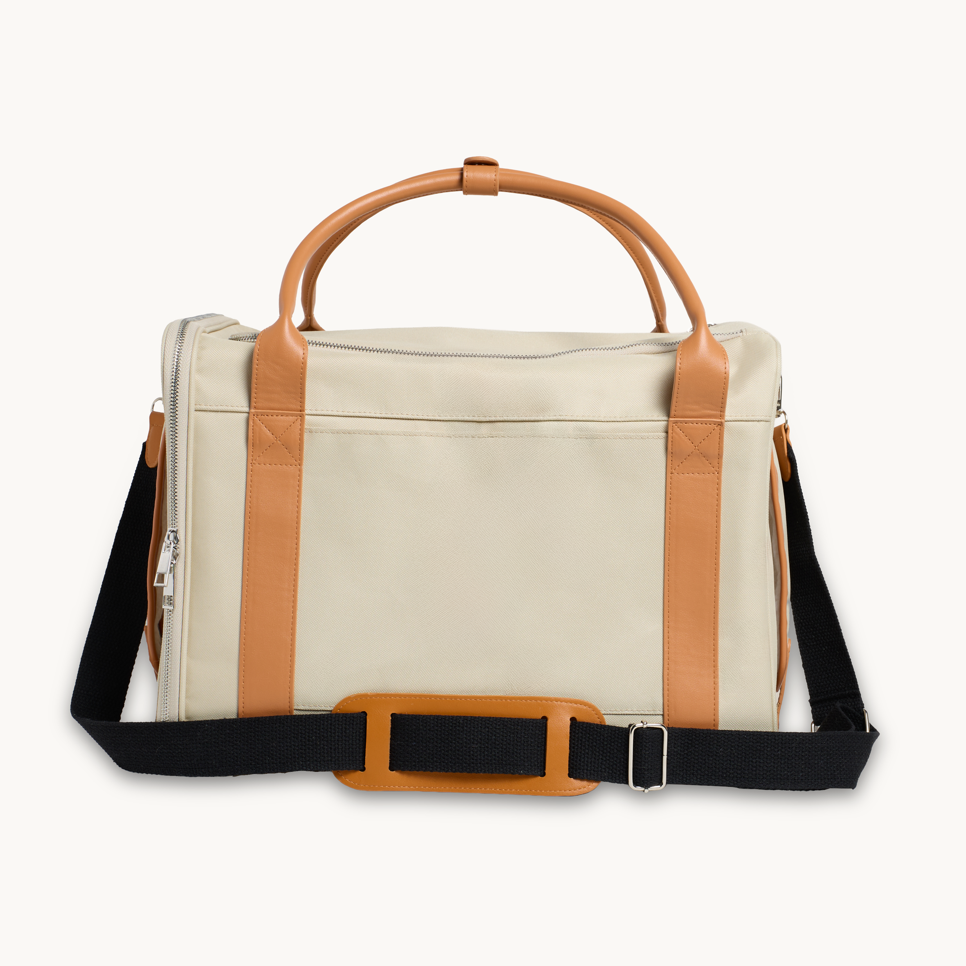 Fabricado con lona de algodón sintético, herrajes de metal y cuero vegano, su diseño es tan elegante como práctico. Su interior está equipado con un acolchado de sherpa suave, base antideslizante y paneles de malla transpirable que aseguran una ventilación óptima en todo momento.